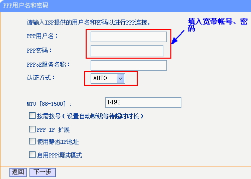 PPP登录名/登陆密码填写宽带帐号/登陆密码,如不清楚请资询服务提供商,PPPoE服务项目名字可不填或是依照服务提供商的需要填好,验证方法挑选AUTO,点一下下一步。