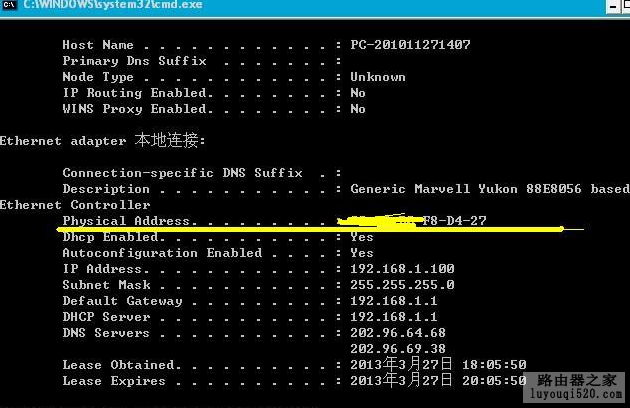 XP系统软件中 “逐渐”→“运作”→键入“CMD”→回车键→键入“ipconfig /all”→回车键。